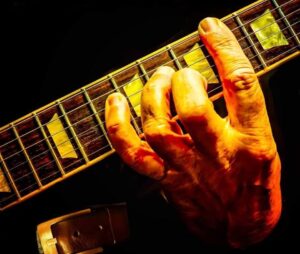 und bringt eine ruhige, aber sehr stabile Präsenz auf die Bühne. Wer ihm genau auf die Finger schaut wird feststellen, dass ein Gitarren-Plektrum für ihn ein Fremdwort ist.