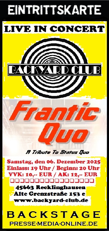 Na, wenn das kein Hammer ist! Zum Jahresabschluss beschert uns FRANTIC QUO im legendären BACKYARD-Club in Recklinghausen am 6. Dezember ein