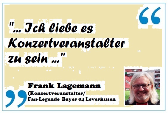Frank Lagemann (Konzertveranstalter „LF Entertainment“): Ich habe immer gerne organisiert und Veranstaltungen durchgeführt. Früher Fußballturniere als Jugendleiter vom TuS Rheindorf, wozu dann auch mal ein Konzert gehörte. Leider hatten da immer zu viele Leute mitgeredet und man musste insgesamt zu viel abstimmen. Das konnte ich alleine oder zu zweit besser.