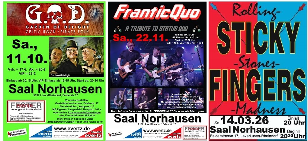 Frank Lagemann (Konzertveranstalter „LF Entertainment“): Oh ja, da kommt einiges. Ich wollte mal wieder ein paar Bands im Saal Norhausen sehen, die noch nie da waren. Dazu natürlich auch altbewährte Bands. Deshalb starten wir am 11. Oktober mit der beliebten IRISH-NIGHT und Garden of Delight. Dann am 22. November zum ersten Mal ein Tribute to Status Quo mit FRANTIC QUO.