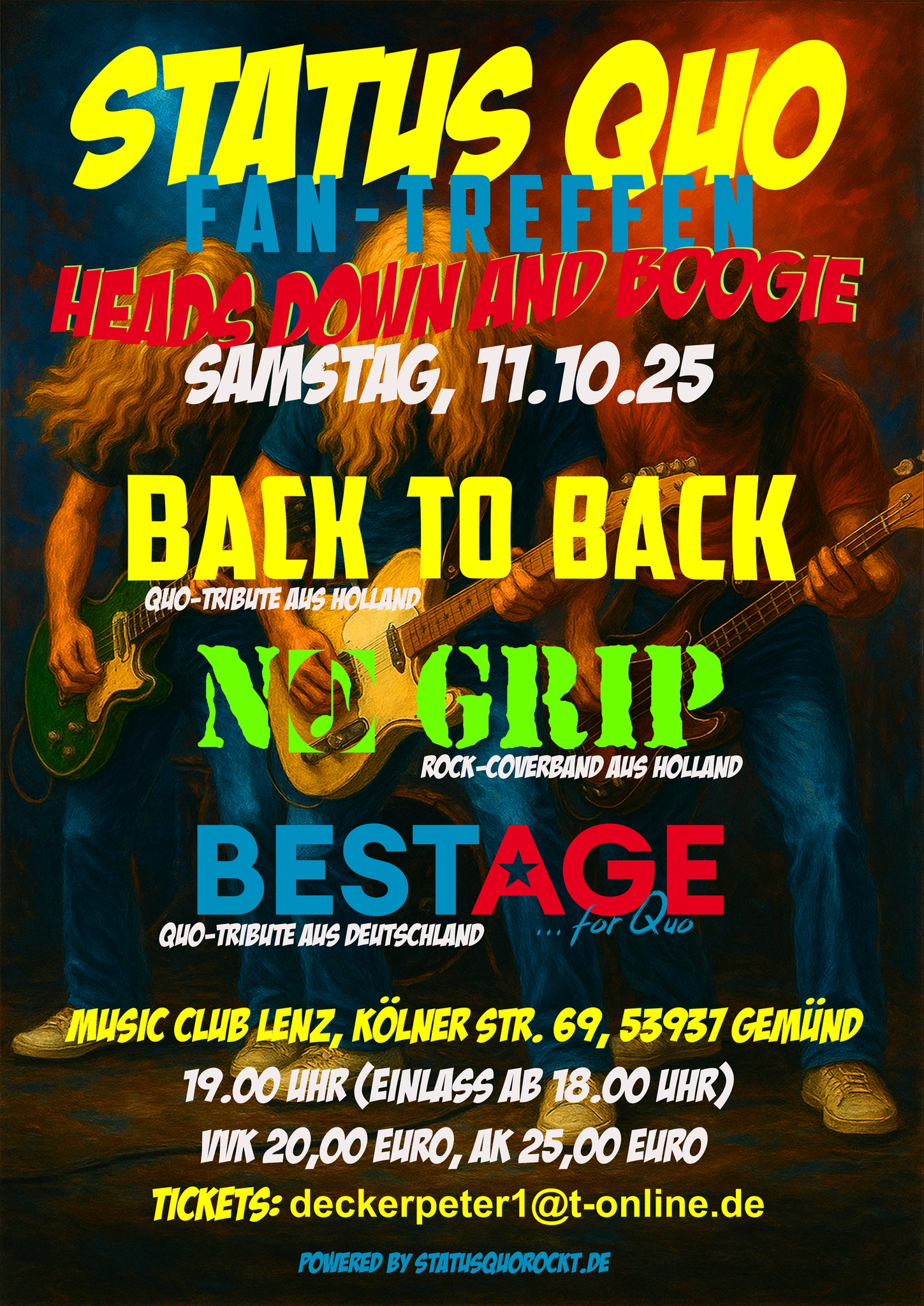 Der krönende Abschluss des Abends ist das Finale, das von der holländischen Quo-Tributeband BACK TO BACK gestaltet wird. Mit einer energiegeladenen Show, die die Stimmung der erfolgreichen Quo-Jahre perfekt einfängt, wird BACK TO BACK den Saal in Ekstase versetzen und den Fans ein unvergessliches Konzerterlebnis bescheren.